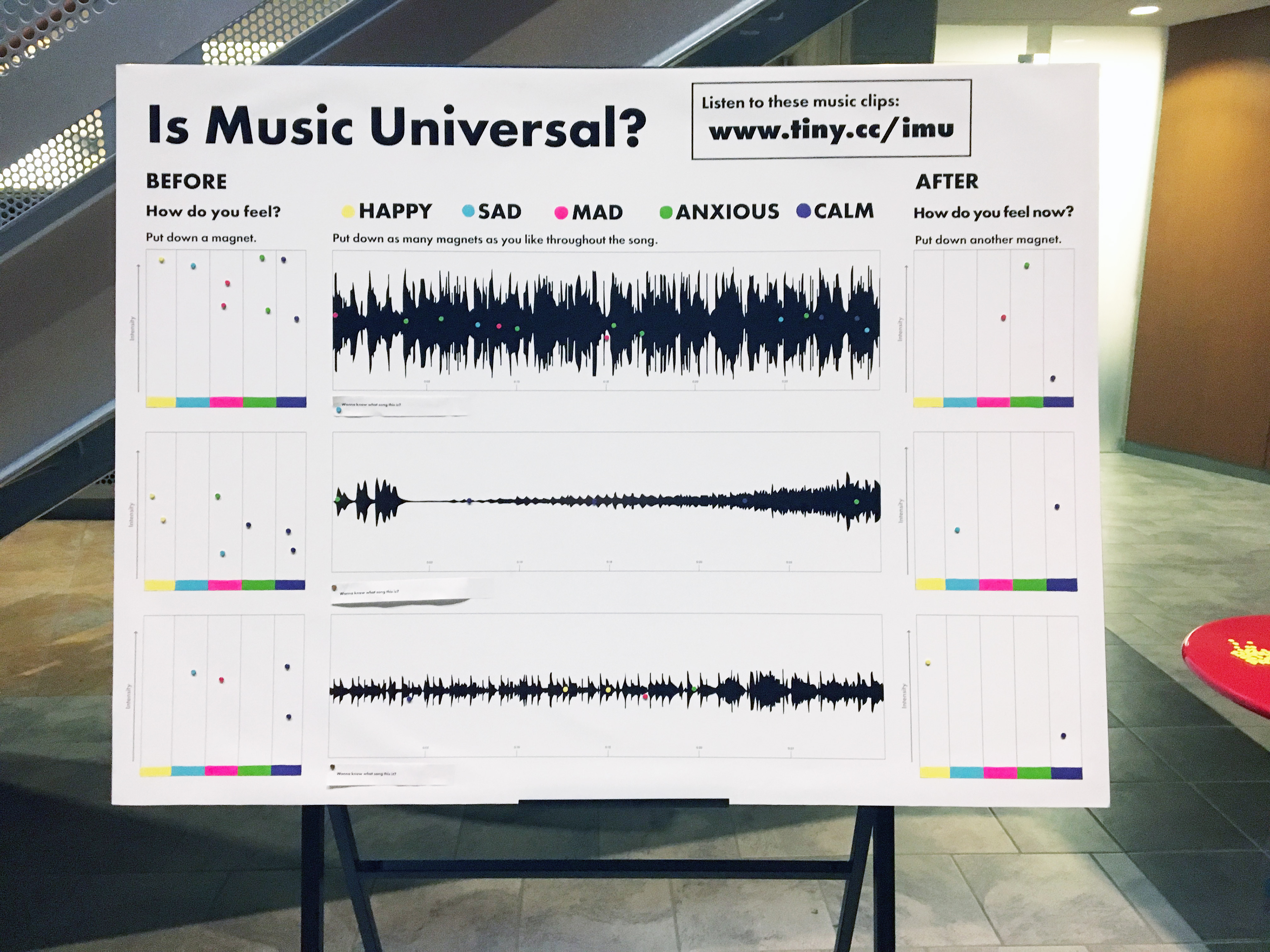In a graphics class, myself and two other students were tasked with creating an interactive material data display, adding an augmented reality component later on. We felt that two things that are fundamentally human are music and emotion. For our project, we wanted to expose people to the same music and see whether they would react similarly or differently towards it. Our display had a few different components. We purchased a whiteboard (so that the display would be magnetic) and created a graphic which was divided horizontally into three different songs, and vertically into before listening to the song, during listening to the song, and after listening to the song. We created colour-coded magnets so that users could graph their emotions before, during, and after listening to the song, and so that this data was impermanent and the board could be reset multiple times. The magnets were kept on a structural fixture next to the board which happened to be magnetic. The link to the song clips were listed at the top of the display, and users were directed to record down their emotions before listening, while listening (on top of a graphical representation of the sound waves) and after listening to the songs. We wanted to see if the songs had an emotional impact on those who stopped to listen. We included a song with English lyrics, an instrumental song, and a song with Portuguese Lyrics. The English song was quite volatile, the instrumental quite neutral, and the Portuguese song quite uplifting (at least to our group members) and we wanted to see what effect these would have on a larger population. To our surprise, we had a high level of engagement with the display, and we even had to go back a few times to record our data and then ‘reset’ the board so that new users could participate. We were able to analyze the data from the board as well as the data from the website where we posted the song clips. From the website, we were able to see that people were more likely to interact with the display in pairs. Similarly, the magnets on the display seemed to be placed in clusters as well, from which we concluded that people felt more comfortable or inclined to interact with friends. The second aspect of the project was to add an augmented reality component, which we achieved through using the HP reveal app. The AR component served to show users metrics from the totality of the data collected, so they could see how others had reacted before them. Because the board was constantly being reset, users couldn’t see the bigger picture, but the AR component solved this issue. From the data analysis we were able to conclude the emotions evoked by the songs and the power behind music to alter mood. We found that the first song created increased anger and anxiety, the second song evoked increased sadness, and the third song improved mood and overall happiness.