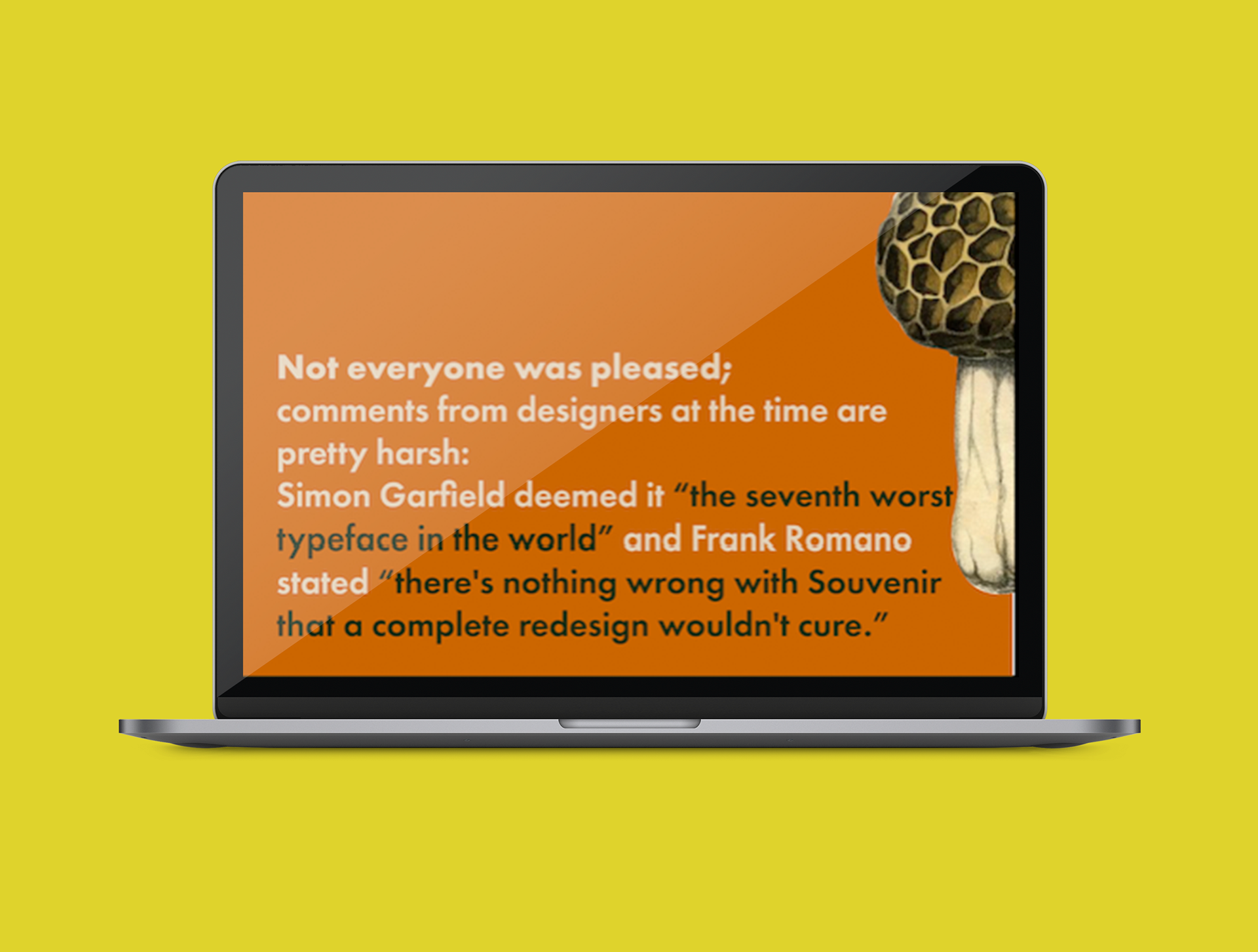 For a digital design class, I was given an assignment to create a mockup of a one-page website which served to personify a typeface of my choice. I chose ITC Souvenir, a font which rose to popularity in the 1970s. I personified the typeface as a boozed-out uncle living in the past, an individual who makes a fool of themselves but is loved regardless. This was based on research which revealed that Souvenir was seen as a joke by designers in its heyday, but it has managed to maintain popularity and evokes nostalgia and friendliness in its presentation. The design is therefore heavily influenced by the 1970s, with collage style images and illustrations throughout which bring Souvenir to life.